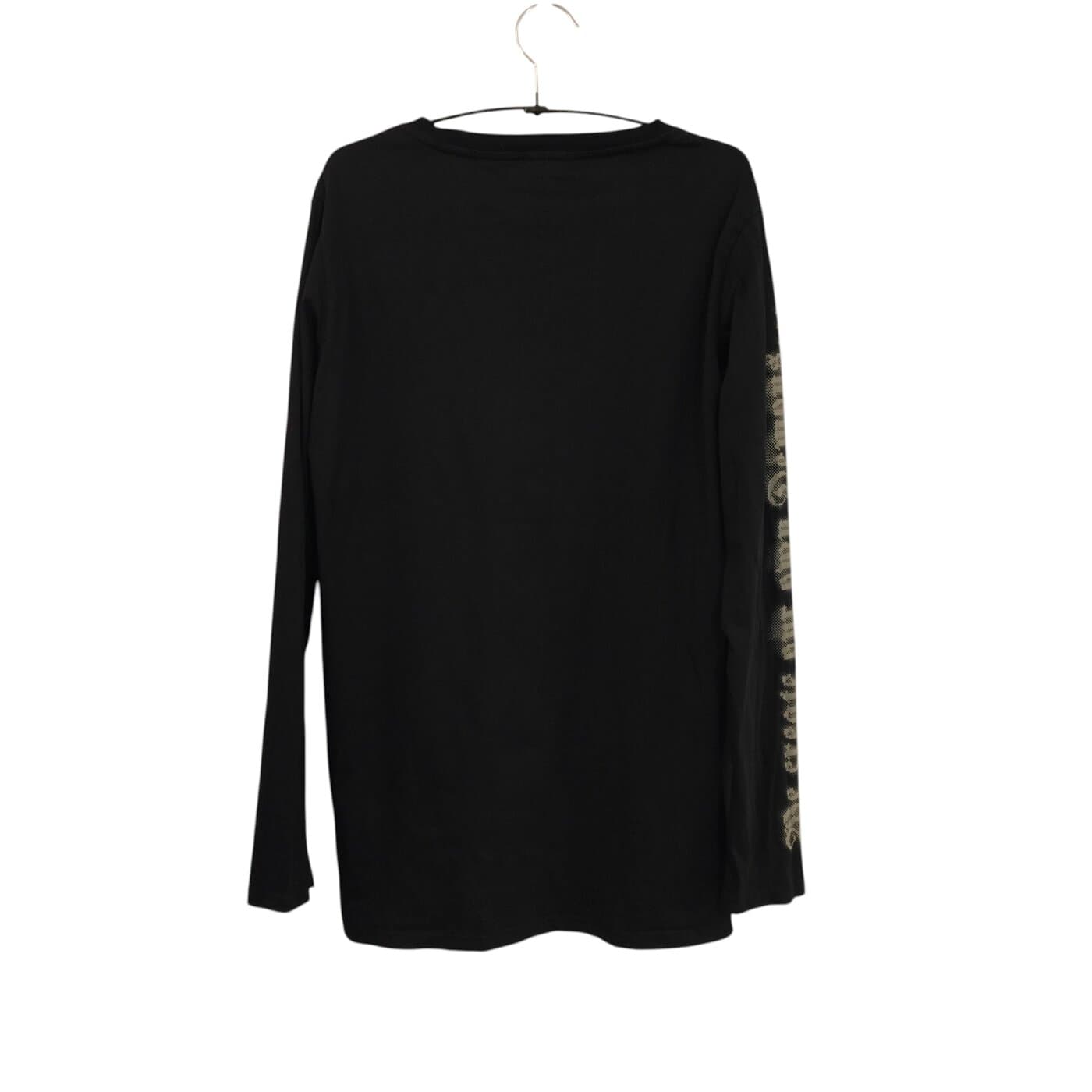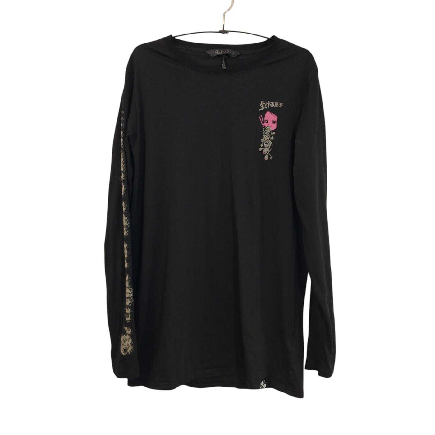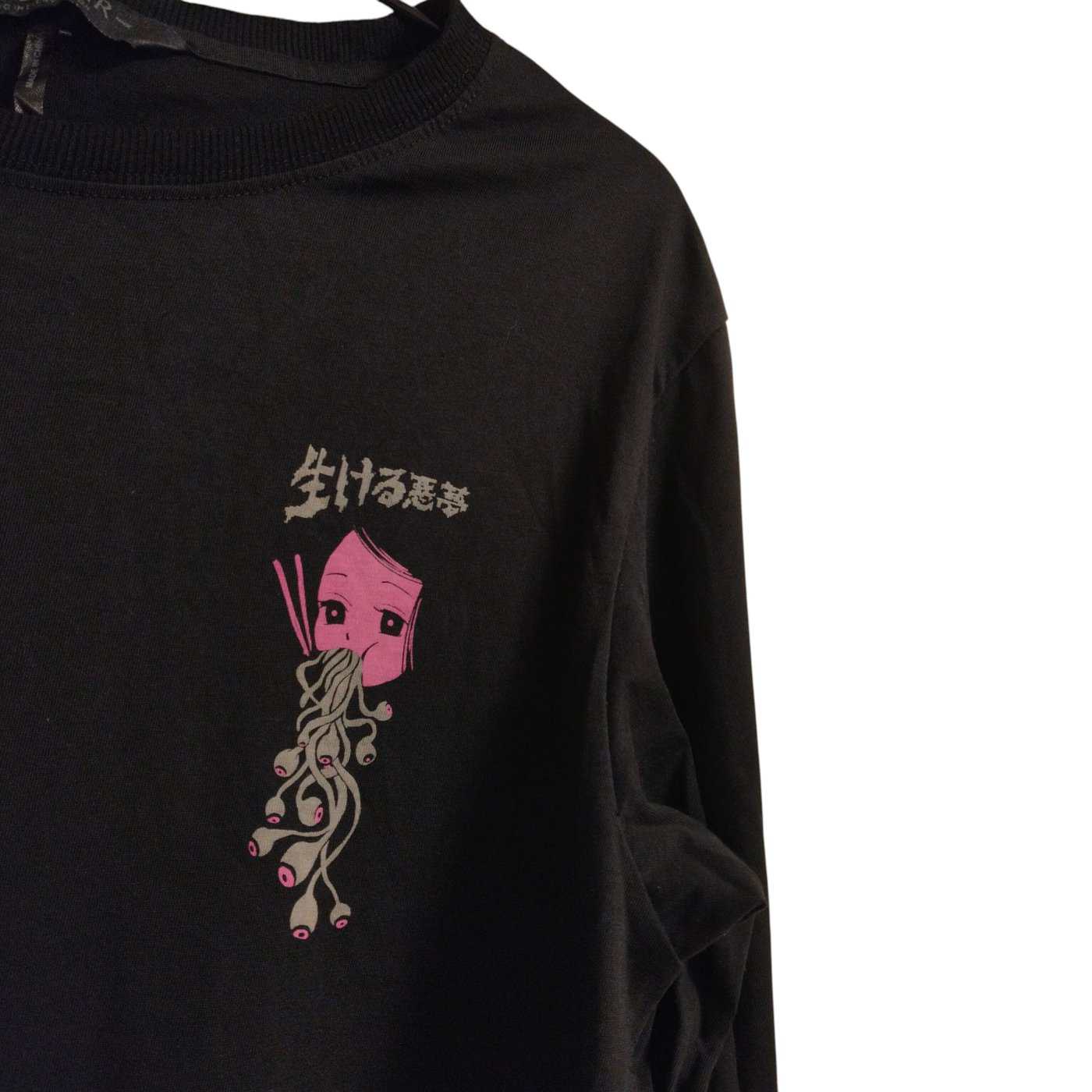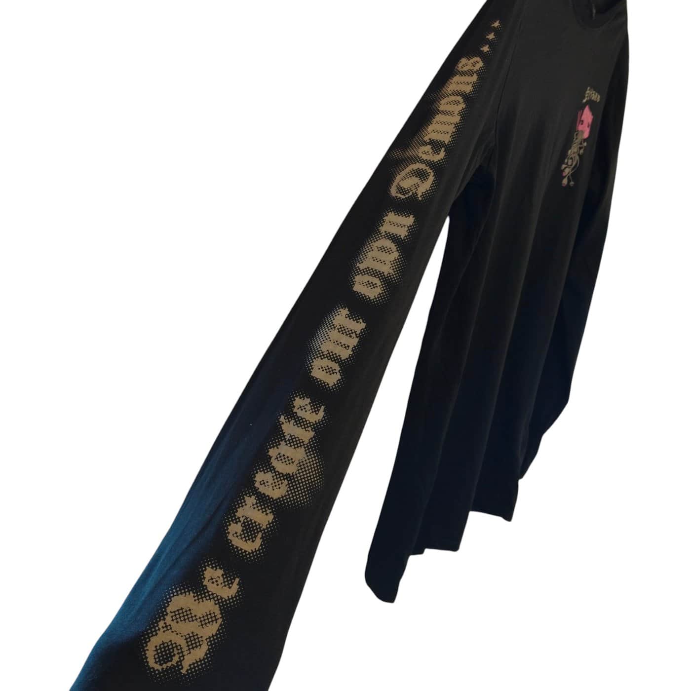 Rinnassa ja hihassa printit, hihassa teksti ”we create our own demons”