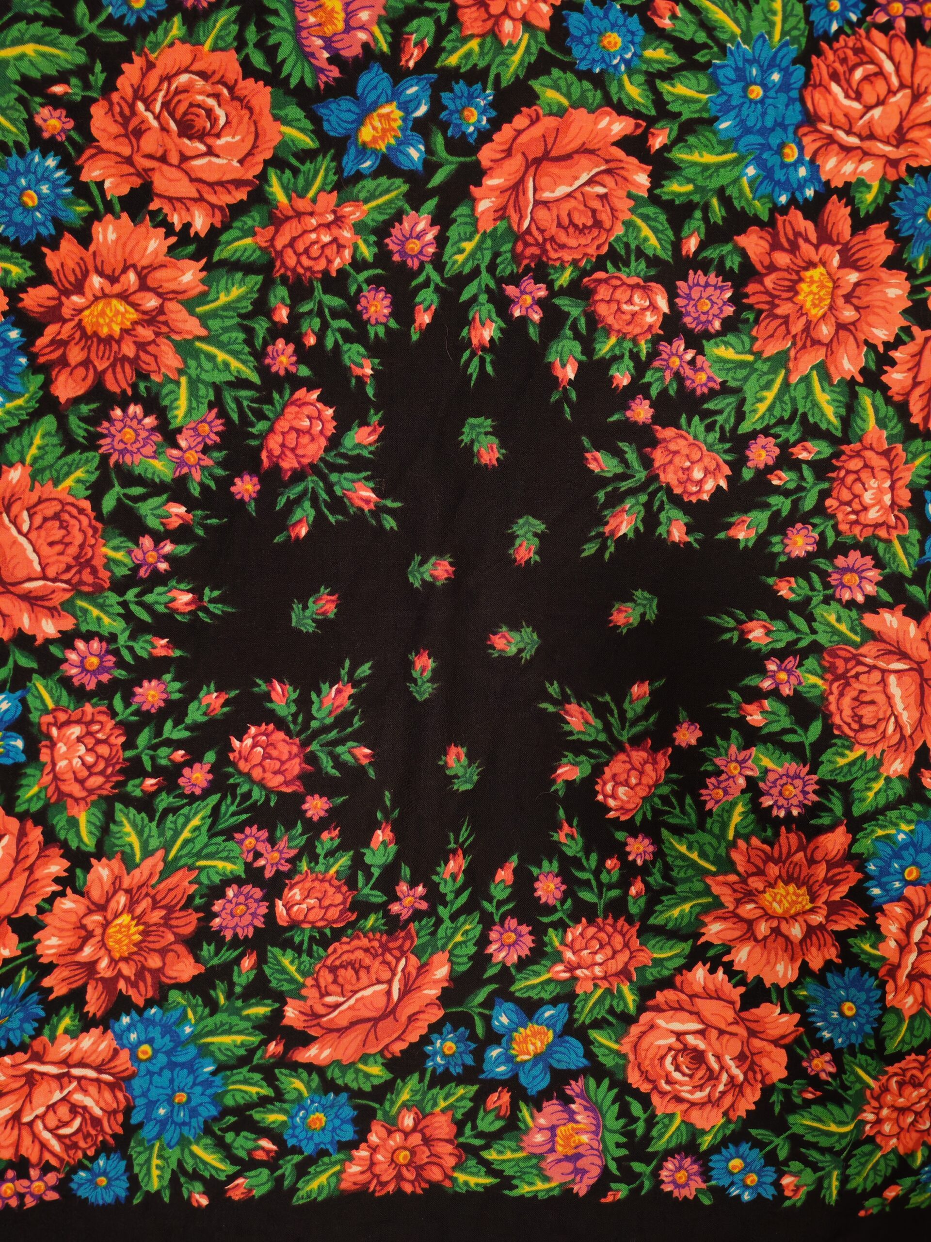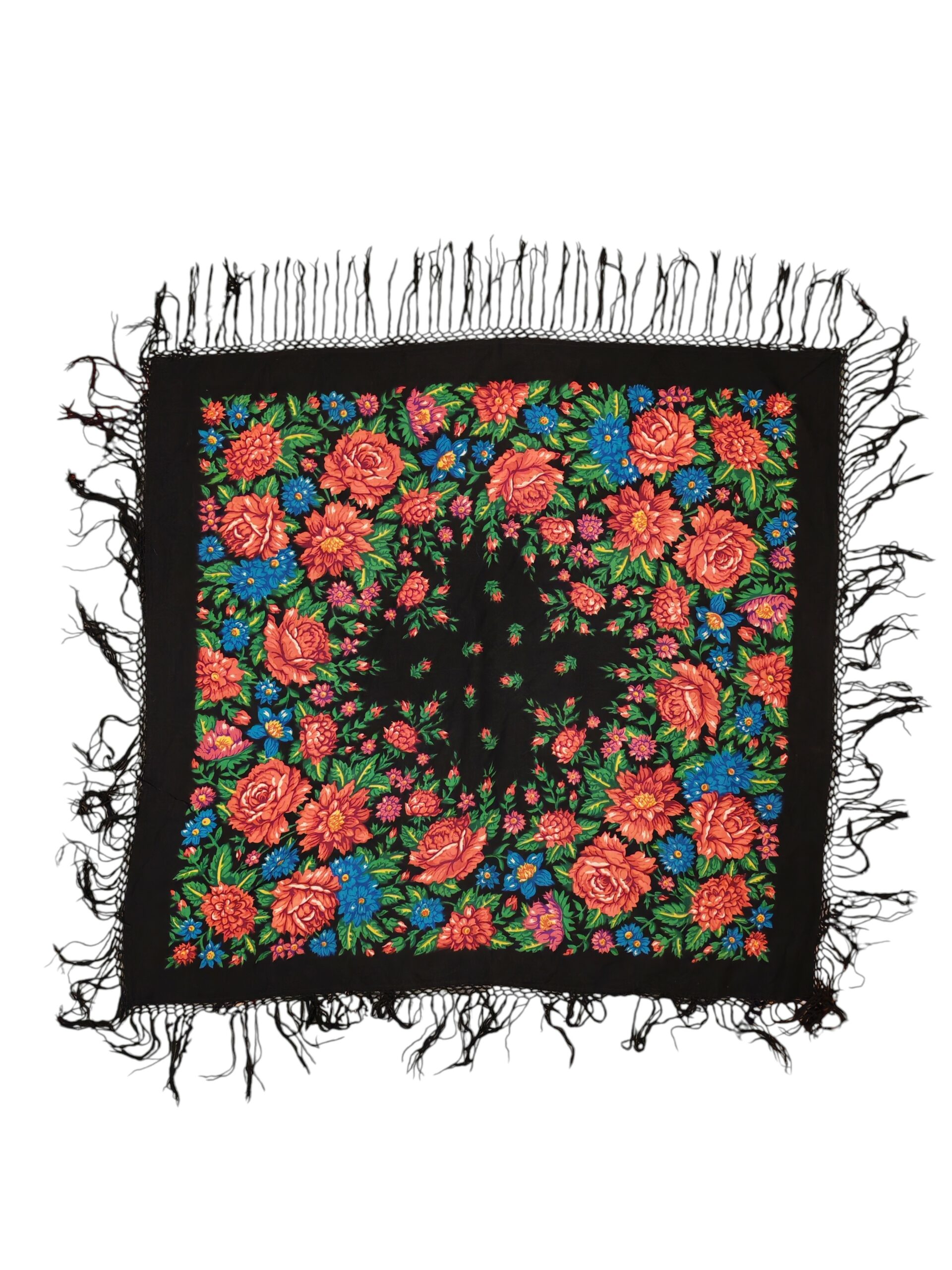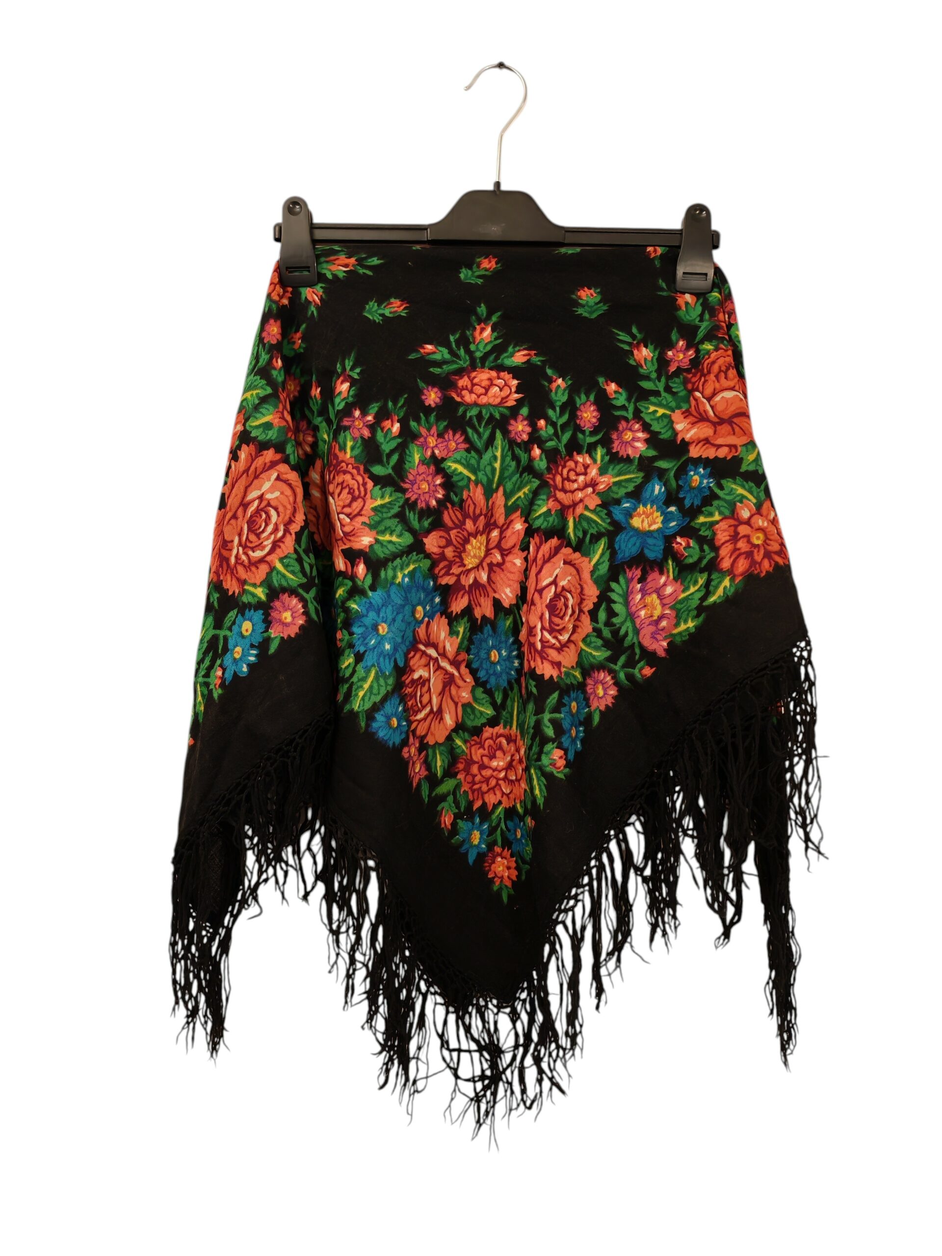 Tuotemerkki ei tiedossa, mustapohjainen Maatuskahuivi hapsuin kaulaan, päähän, lanteille tai vaikkapa pöydälle!
