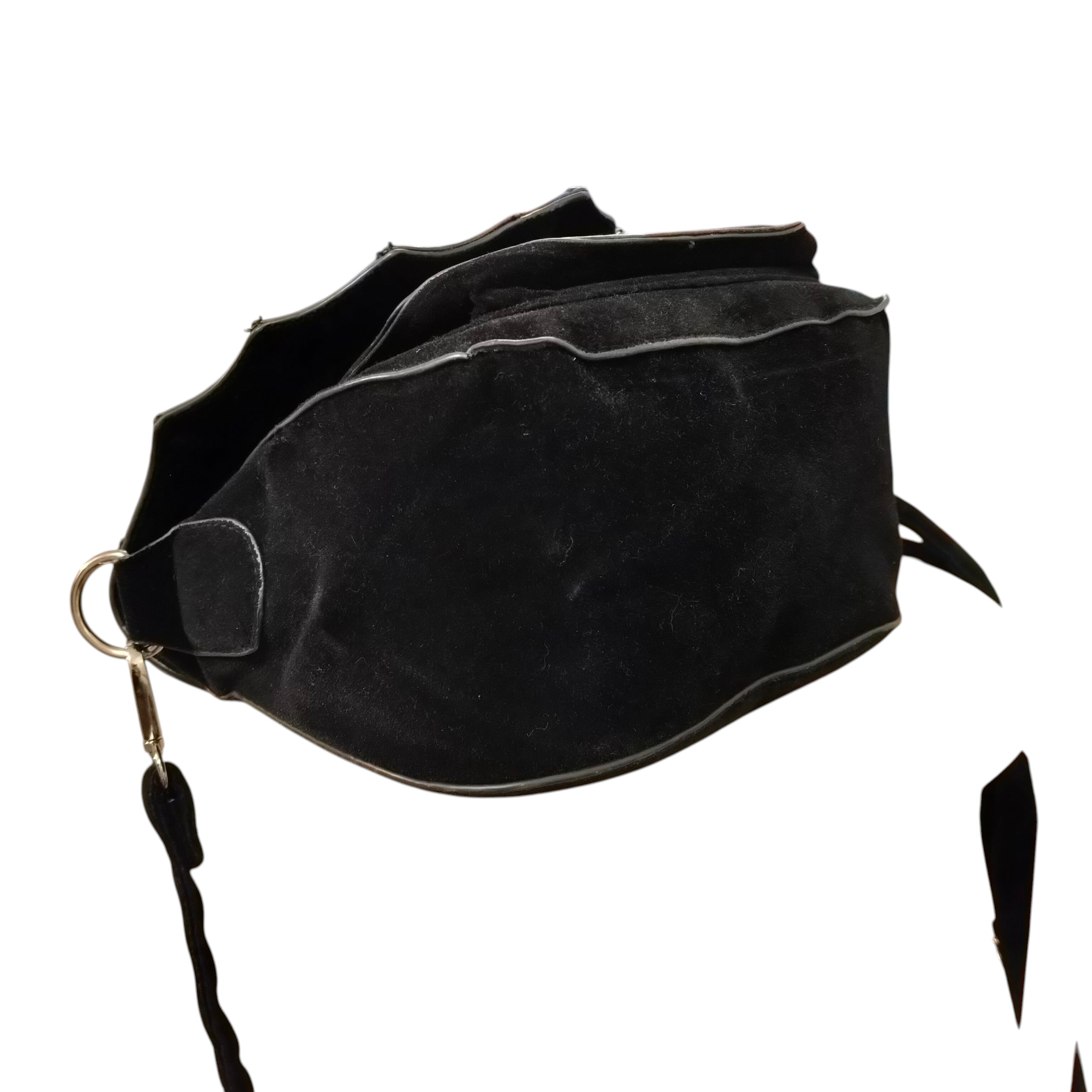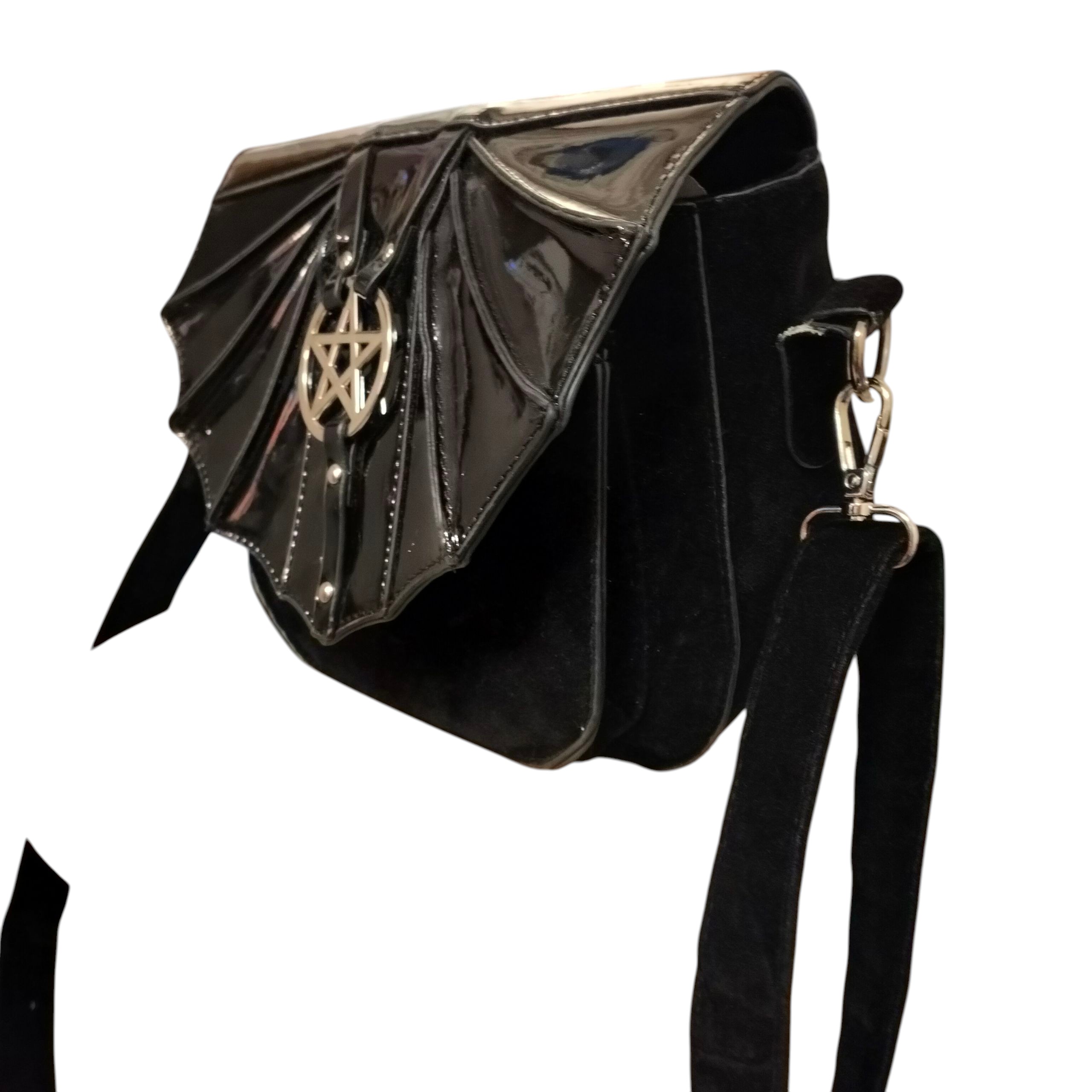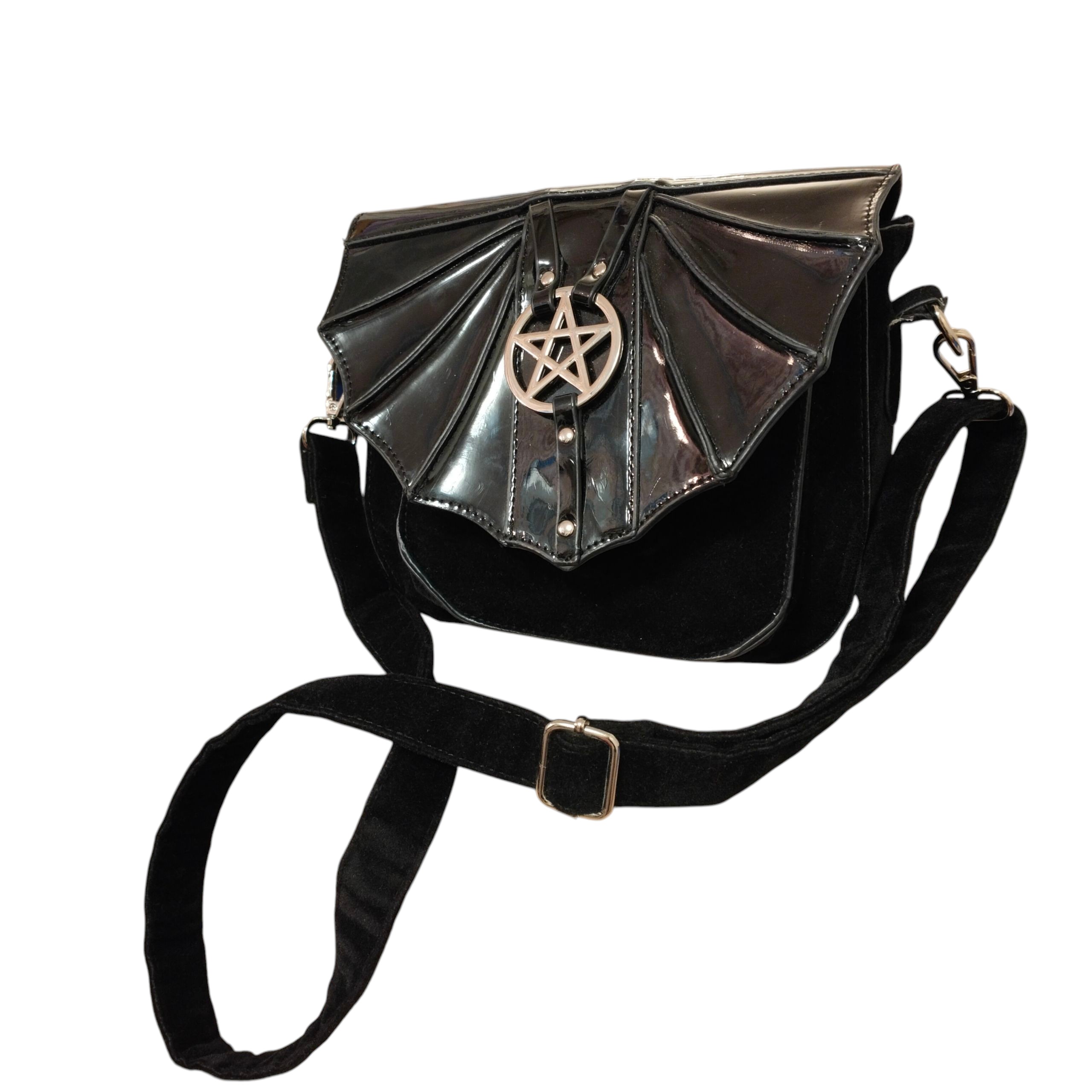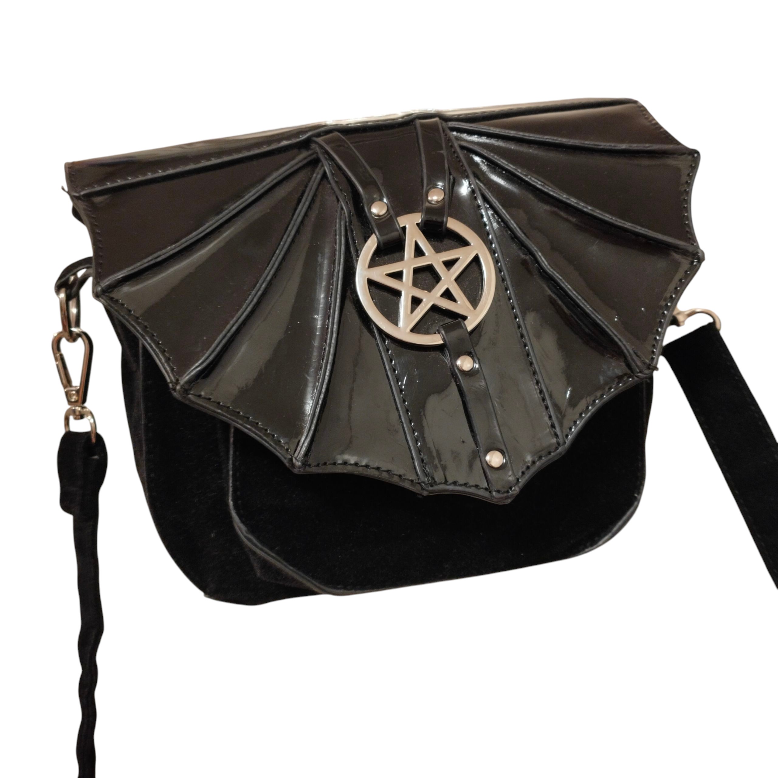 Läppä pvc:tä, jossa pentagram ja muuten mustaa samettista materiaalia