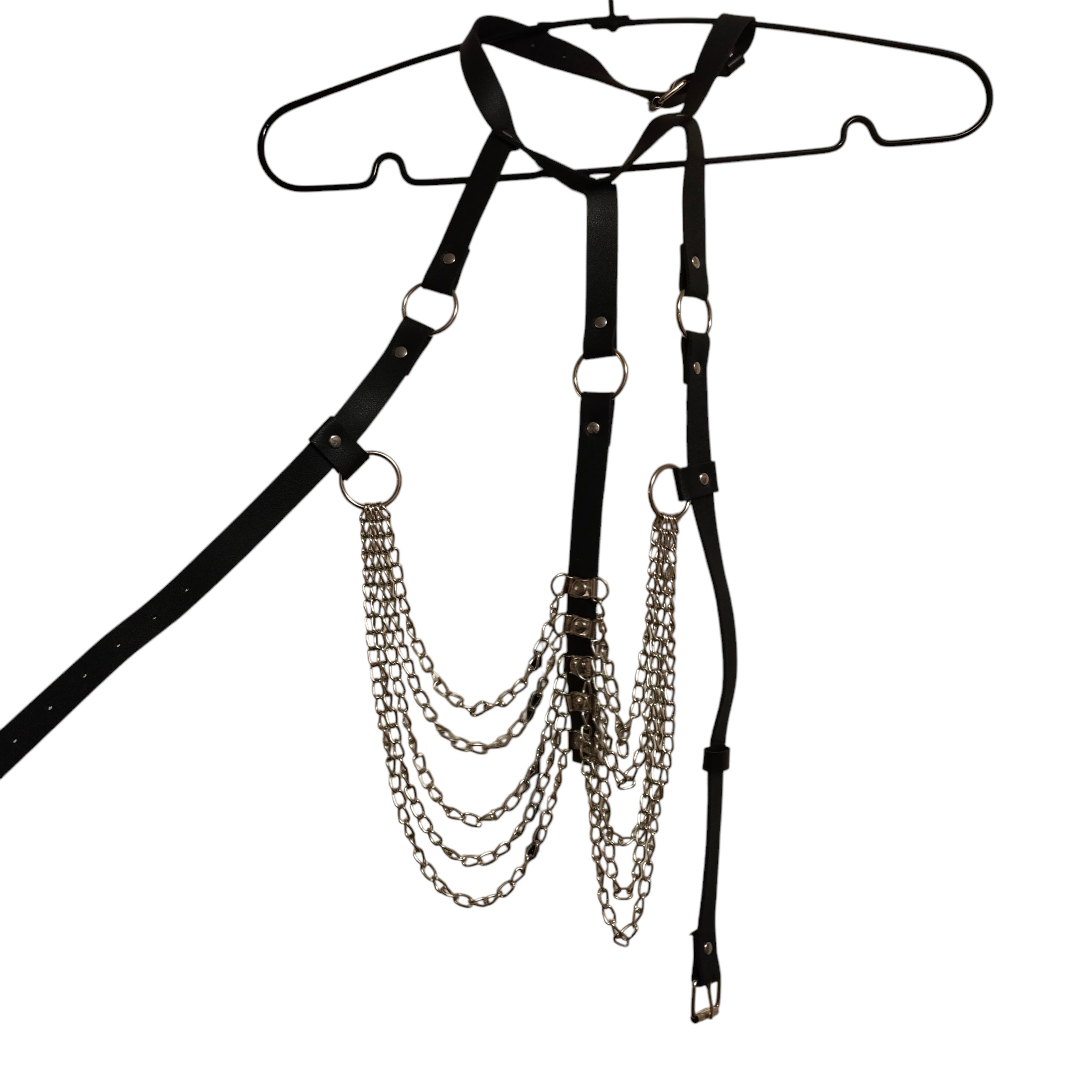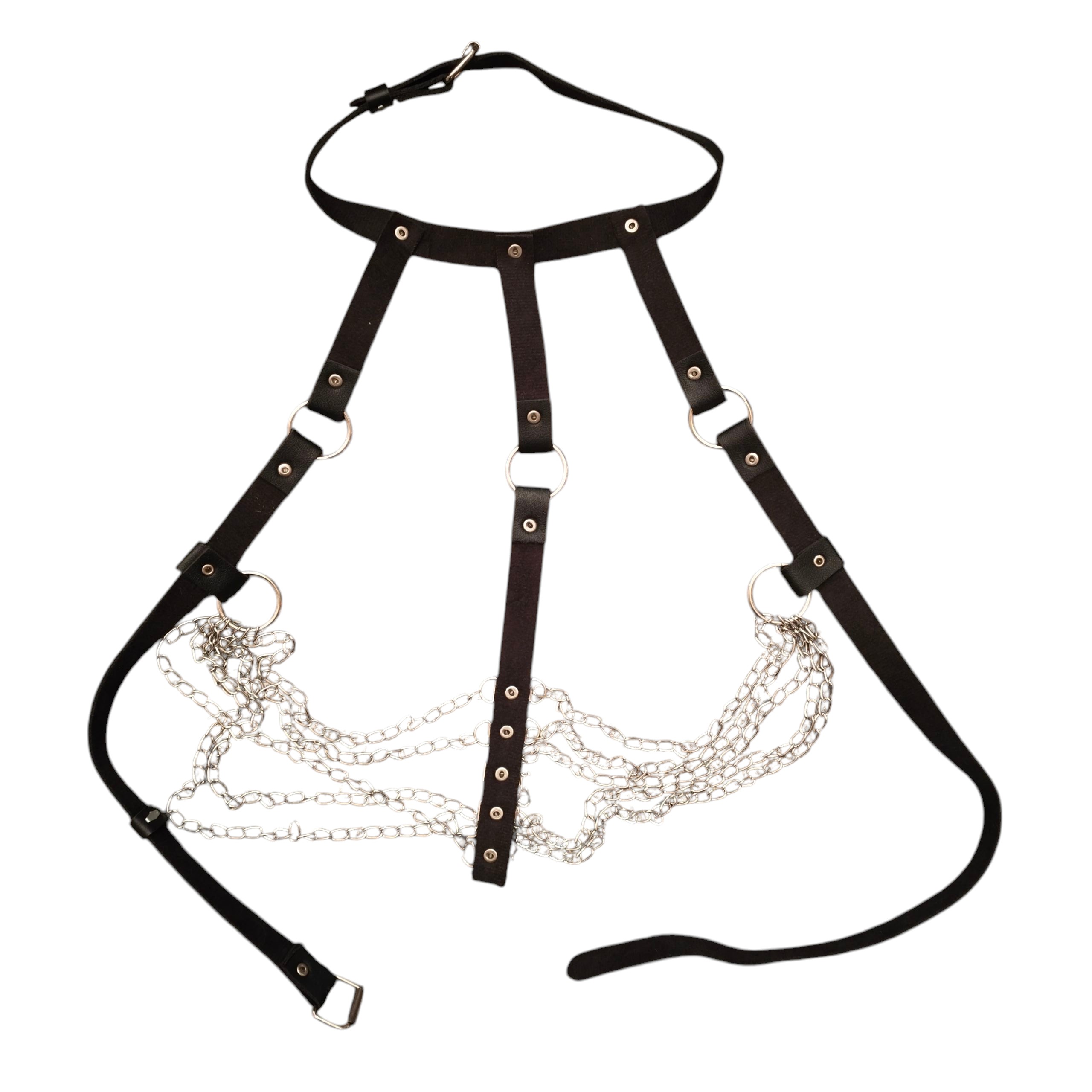 Tuotemerkki ei tiedossa, musta yläosan harness, joka menee käsien alta ja ketjut asettuvat rintojen päälle
